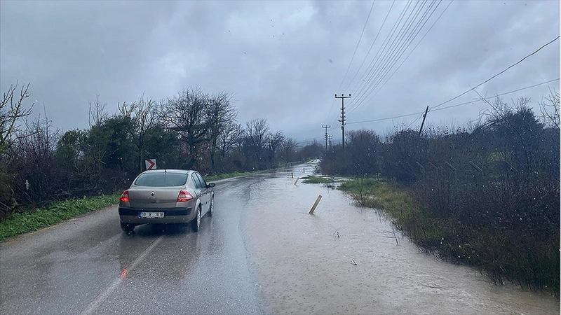Yağış nedeniyle Ayvacık ve Küçükkuyu arasındaki bağlantı yolu kapandı, sürücüler su birikintileri nedeniyle trafikte ilerlemekte güçlük çekti.