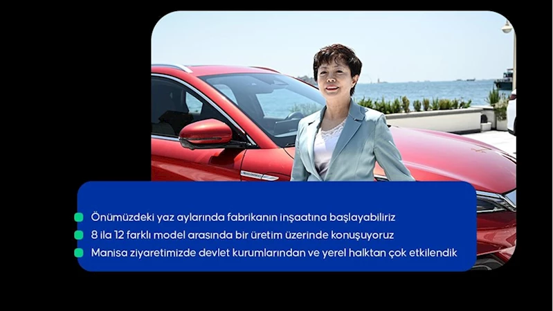 "8 ila 12 farklı model arasında bir üretim üzerinde konuşuyoruz"Li, üretim tesisinin kurulacağı Manisa'ya bir ziyaret gerçekleştirdiklerini ve buradaki devlet kurumlarından ve yerel halktan çok etkilendiklerini dile getirerek, "Çok profesyoneller ve araziyi çok beğendik. Burası bizim evimiz olacak ve burada yerel bir Türk şirketi gibi olacağız." açıklamasında bulundu.