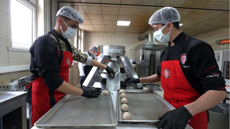 Fırında 10 öğrencinin çalışıp eğitim gördüğünü anlatan Sökmen, "10 öğrencimizle günlük 6 bin tam buğday ekmeği üretiyoruz. Günlük 5 bin kişilik yemek. Kafeteryamız için günlük 150 kilograma yakın kuru pasta üretilmektedir. Aylık 2 bin 500 yaş pasta üretilmektedir. Bunların tamamı okulumuzdaki öğrenci ve öğretmenler tarafından yapılmaktadır." diye konuştu.