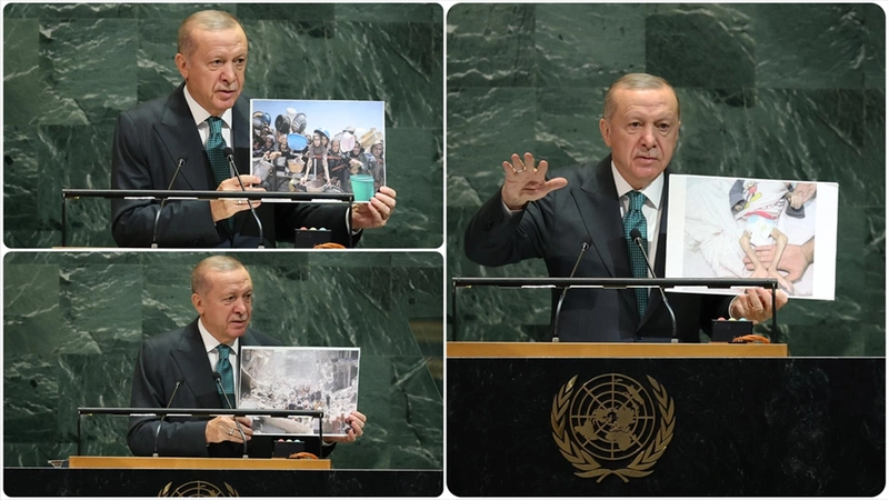 Hitabında, önceki yıllarda katıldığı toplantılarda olduğu gibi bu yıl da dünyanın dikkatini Gazze'de yaşanan soykırıma çeken Erdoğan, İsrail'in yaptığı soykırımı AA'nın fotoğrafları ile belgeledi.