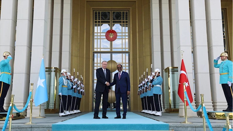 ANKARA (AA) - Cumhurbaşkanı Erdoğan, Mahmud'u Cumhurbaşkanlığı Külliyesi girişinde karşıladı, merdivenlerde Türk ve Somali bayrakları önünde fotoğraf çektirdi.