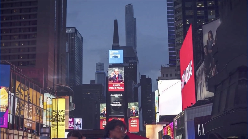 Cumhurbaşkanı Erdoğan'ın "Daha Adil Bir Dünya Mümkün" sözü, Times Meydanı'ndaki ekranlarda