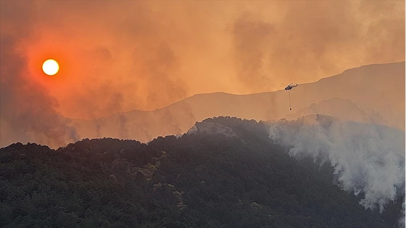 Helikopterler, sarp kayalıklar üzerinde devam eden yangına su atıyor.