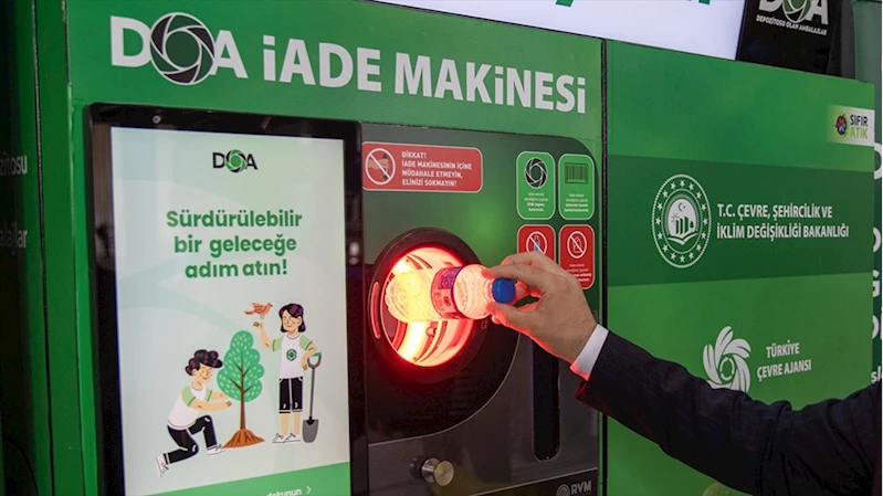 ANKARA (AA) - Cumhurbaşkanı Recep Tayyip Erdoğan'ın eşi Emine Erdoğan'ın himayelerinde Çevre, Şehircilik ve İklim Değişikliği Bakanlığınca yürütülen Depozito Yönetim Sistemi projesi kapsamında "Depozitosu Olan Ambalajlar" (DOA) logosu taşıyan plastik, cam ve alüminyum gibi malzemeler, iade makineleri aracılığıyla geri kazandırılıyor.