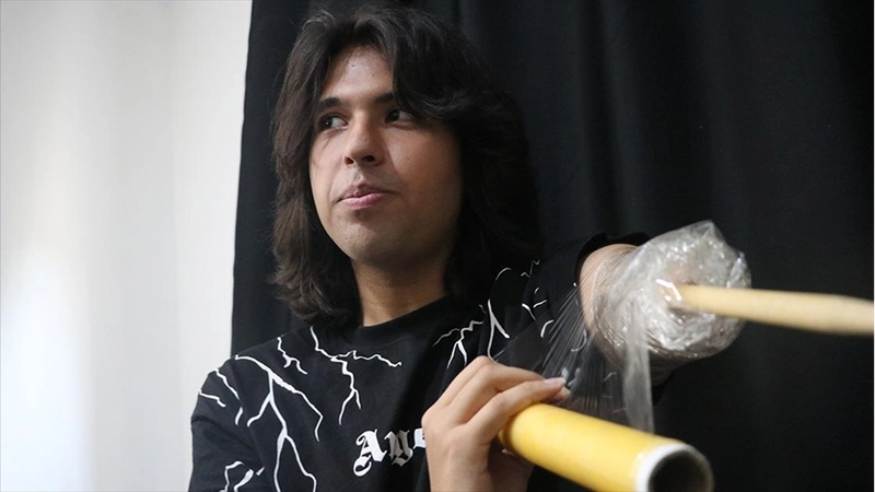Depremde kolunun büyük bölümünü kaybeden genç, streç filmle sabitlediği bagetle bateri çalıyor
