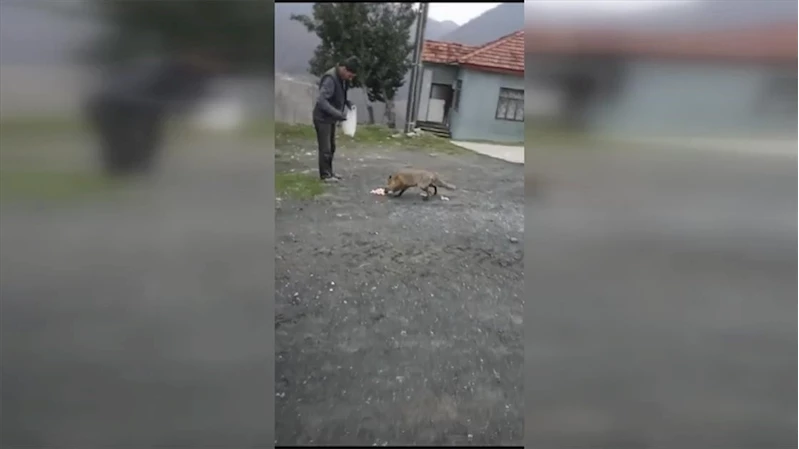 Üç gündür köye inip muhtar ve yeğeni tarafından beslenen tilki, cep telefonu kamerasıyla görüntülendi.