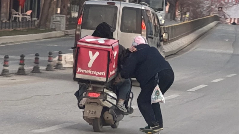 Dengede durmaya çalışan motokuryenin seyir esnasında kaykaycıyı düşmemesi için tuttuğu da görüntüye yansıdı.