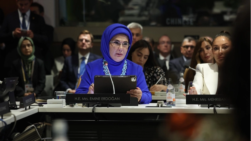 Gazze'deki insanlık dramına da dikkati çeken Emine Erdoğan, "Tüm insanlığı, Gazze'nin sesi olmaya, kalıcı ve adil bir barış için insani koridorlar açmaya, uluslararası hukuk ve adalet mekanizmalarını işler kılmaya davet ediyorum." çağrısında bulundu.