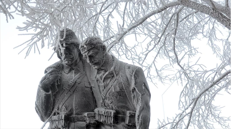Sarıkamış Allahuekber Şehitliği'ndeki asker heykeline de kırağı düştü.