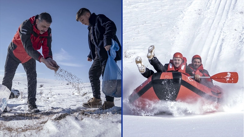 Zaman zaman kara saplanan 4x4 araçlarıyla karlı dağları aşan macera tutkunları ile Vali Çiftçi, doğada zor şartlarda yaşam mücadelesi veren hayvanlar için yanlarında getirdikleri yemleri toprağa bıraktı.