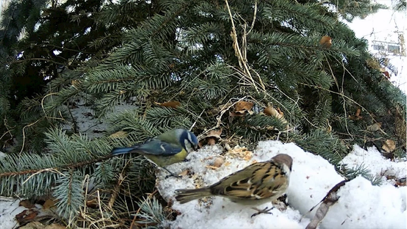 Bir süre sonra serçe ve mavi baştankara kuşlarının kar üstünde birlikte beslenmesi fotokapanla kaydedildi.