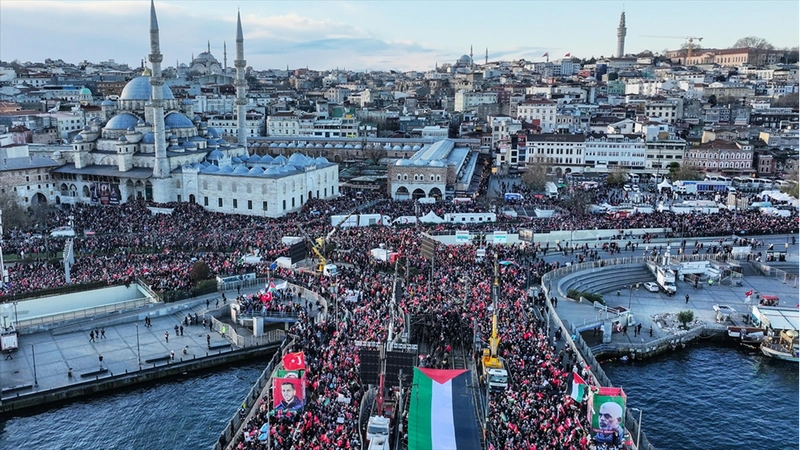 İSTANBUL (AA) - Türkiye Gençlik Vakfı (TÜGVA) öncülüğünde, "Sinmiyoruz, susmuyoruz, Filistin'i unutmuyoruz" sloganıyla yapılan eylem için Ayasofya-i Kebir Cami-i Şerifi, Sultanahmet Camii ve Eminönü'ndeki Yeni Cami ile Fatih ve Süleymaniye camilerinin önlerinde toplanan katılımcılar, kortejlerle Galata Köprüsü'ne yürüdü.