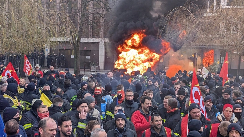 İş kıyafetleri ve ellerinde araç lastiğiyle eyleme katılan itfaiyeciler, Lille'de çevre yoluna çıkarak araç trafiğinin aksamasına neden oldu.