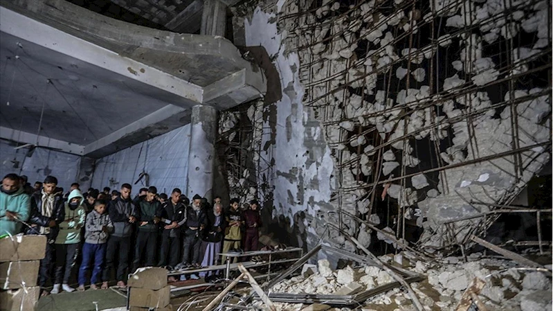 Gazze Şeridi'nin en büyük ve en eski camisi olarak bilinen "Büyük Ömeri" başta olmak üzere İsrail saldırılarında yıkılan camilerin enkazı arasında saf tutan Filistinliler, hep birlikte tekbirler eşliğinde teravih namazını kıldı.