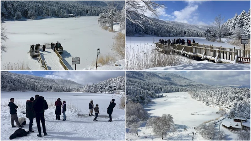 Bölgeye gelen tatilciler, yüzeyi buzla kaplı göl çevresinde yürüyüş yaptı, iskelede fotoğraf çektirdi, kızak ve şambriyellerle kaydı.