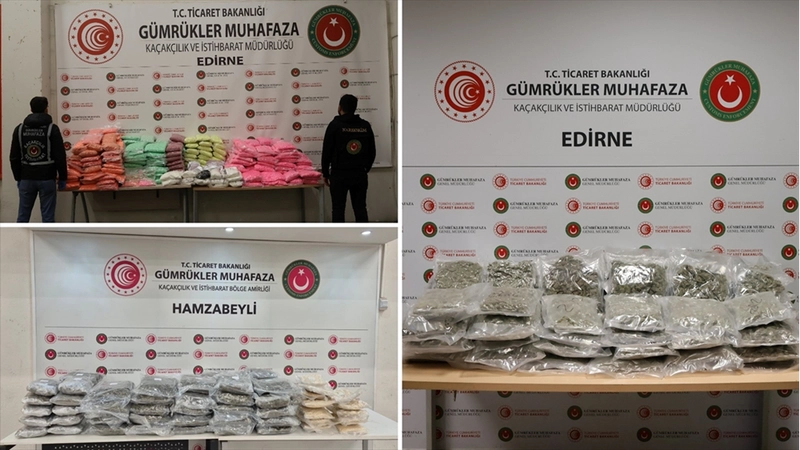 "Edirne, Hamzabeyli ve Sabiha Gökçen Gümrük Muhafaza Kaçakçılık ve İstihbarat birimlerimizce yürütülen operasyonlar neticesinde, 2 milyon 500 bin ecstasy, 170 bin 500 captagon, 74 kilogram esrar, 26 kilogram sentetik uyuşturucu madde ele geçirildi, yakalanan uyuşturucu maddeler imha edildi."