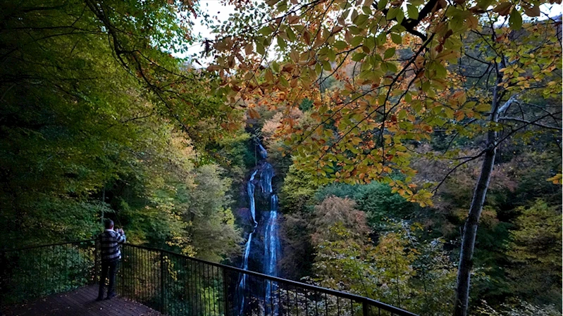 DÜZCE (AA) - Güzeldere köyünde bulunan ve 130 metre yükseklikten akan şelaleyi saran köknar ve çınar ağaçları, sonbaharın renklerine büründü.