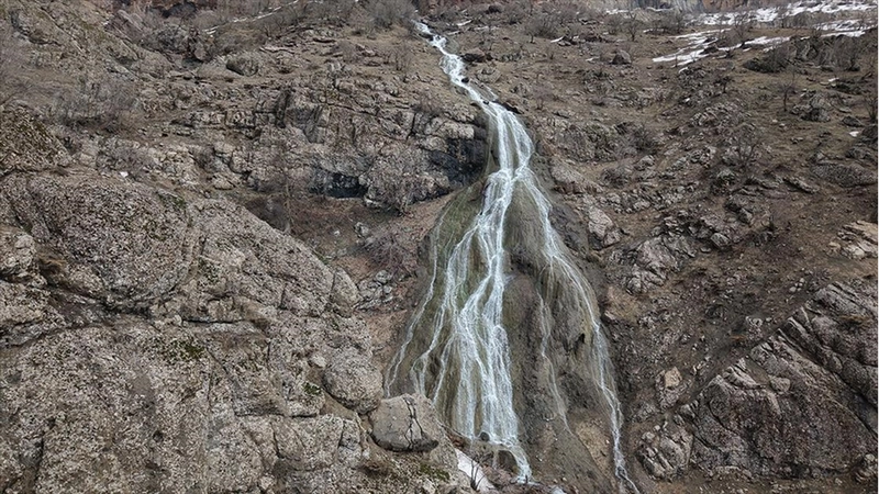 Metrelerce yükseklikteki sarp kayalıklardan süzülen şelale, dron ile görüntülendi.