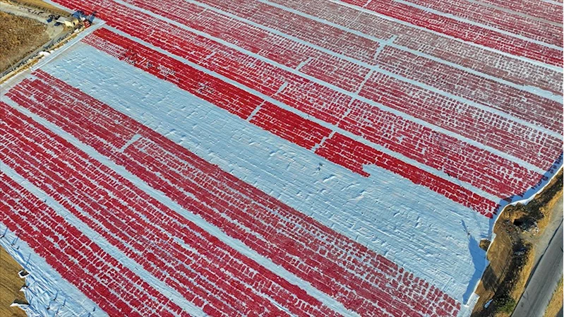 Kurutma sergileriyle kırmızı renge bürünen ovada kuruyan domatesler, paketleme tesisinin ardından ihraç ediliyor.