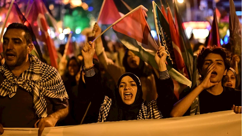 Buradan hareket eden kalabalık, Türk ve Filistin bayrakları taşıyarak İsrail aleyhine sloganlar attı.
