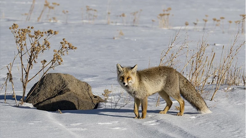 İlkbaharda beyaza bürünen Kars'ta tilkilerin yiyecek arayışı görüntülendi