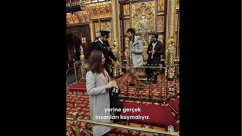 Lordlar Kamarası turuna katılan üç aktivist, Kral 3. Charles’ın tahtının bulunduğu bariyerle çevrili bölüme girerek "Lordları değiştir" yazılı pankart açtı.