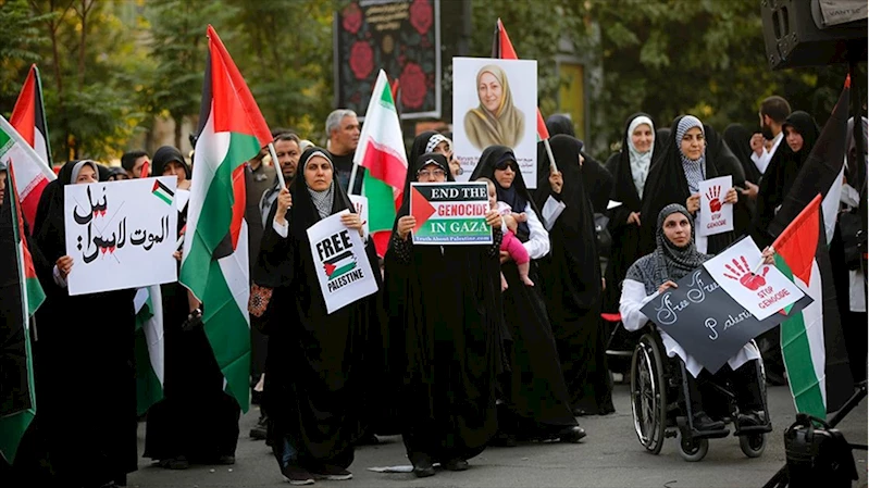 İran ve Filistin bayraklarıyla gösteri düzenleyen grup, "Gazze'yi kurtarın" "Soykırımı durdurun" yazılı dövizler taşıdı.