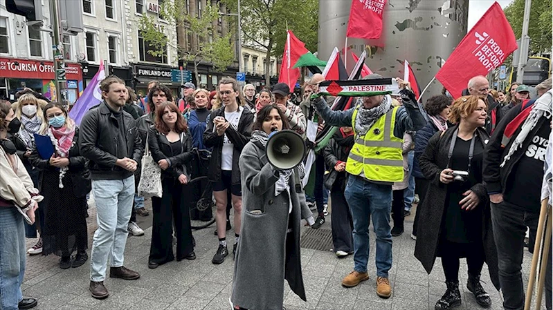 Şehirdeki Işık Anıtı önünde bir araya gelen aktivistler de Filistin ve İrlanda bayrağı açarak Trinity College'a yürüdü.
