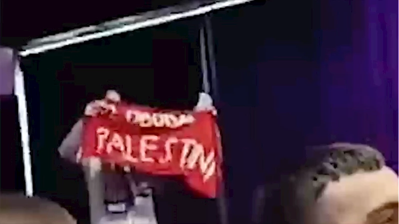 "Gazze Hareketi" isimli grup da salonda "AWS soykırıma yatırım yapıyor" yazılı döviz açtı.