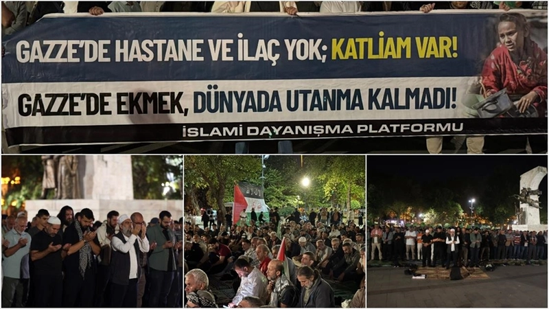İSTANBUL (AA) - Fatih'teki Saraçhane Parkı'nda yatsı namazında toplanan katılımcılar Kur'an-ı Kerim okudu. Eylemde, İsrail'in saldırısı altındaki Filistin ve Gazzeliler için dua edildi.