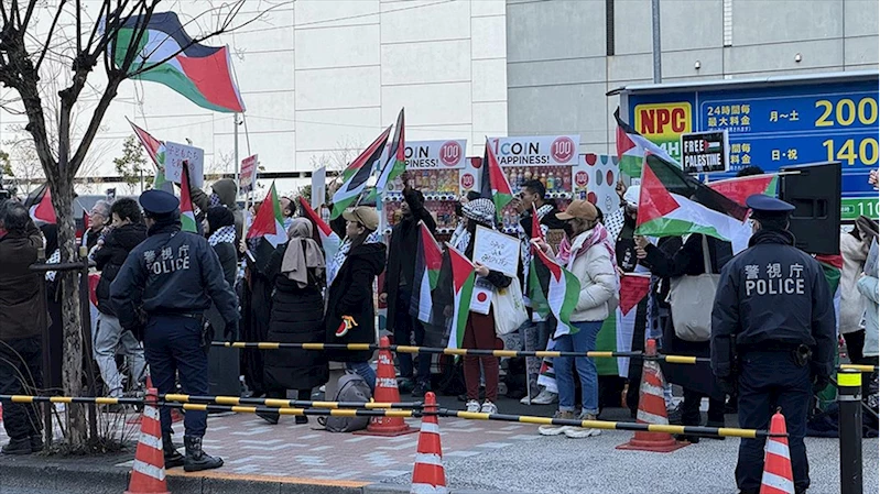 TOKYO (AA) - Farklı sivil toplum örgütlerinin mensupları, Tokyo'nun Çiyoda ilçesinin Hanzomon bölgesindeki İsrail Büyükelçiliğinin yer aldığı caddenin girişinde bir araya geldi.