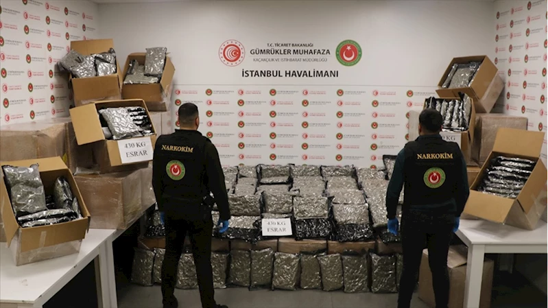 ANKARA (AA) - Bakanlıktan yapılan açıklamaya göre, İstanbul Havalimanı Gümrük Muhafaza Kaçakçılık ve İstihbarat Müdürlüğü NARKOKİM birimlerince gerçekleştirilen risk analizi çalışmaları kapsamında, yurt dışından gelen ve transit olarak bir Avrupa ülkesine gönderilmek istenilen hava kargo gönderisi şüpheli bulunarak incelemeye alındı. Yapılan detaylı aramada, narkotik dedektör köpekler de kolilere tepki verdi. Bunun üzerine ekiplerce açılan kolilerin içinde 430 kilogram esrar cinsi uyuşturucu bulundu.