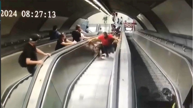 İZMIR (AA) - Görüntülerde yürüyen merdivenle yukarı doğru çıkan vatandaşların, merdivenin ters yöne hareket etmesi sonucu dengesini kaybederek düşmesi yer aldı.