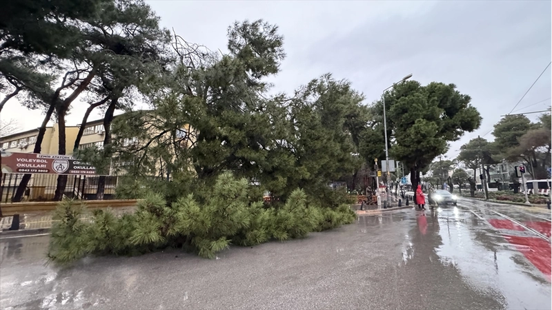 İzmir Atatürk Lisesi bahçesindeki bir çam ağacının yola devrilmesi üzerine, itfaiye ekipleri bölgede çalışma yaptı.