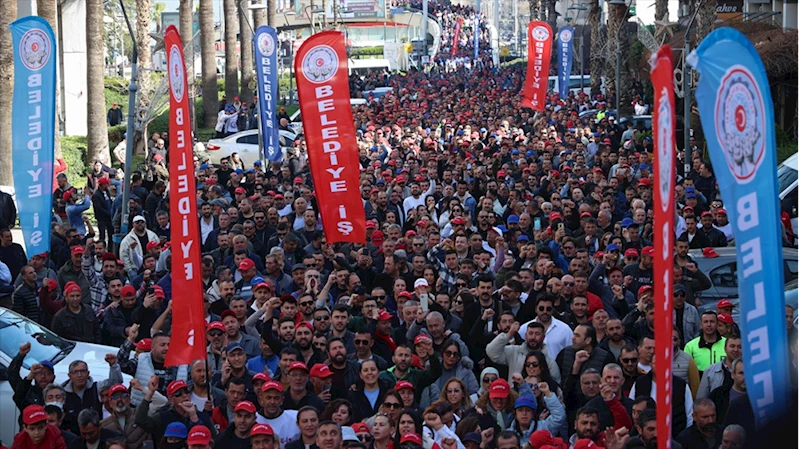 İZMİR (AA) - Konak Pier önünde toplanan çok sayıda işçi, "Sadaka Değil Toplu Sözleşme" yazılı pankart açarak İzmir Büyükşehir Belediye Başkanlığı önüne yürüdü.