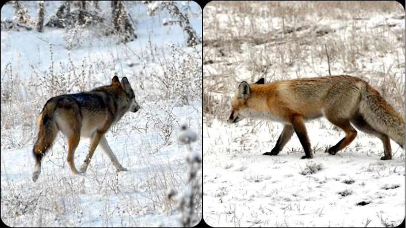 İlçeye bir kilometre uzaklıktaki Çamaşır Dere ve Hançerli düzü bölgesindeki karlı arazide yiyecek arayışına çıkan kurt ve tilkiler objektife yansıdı.