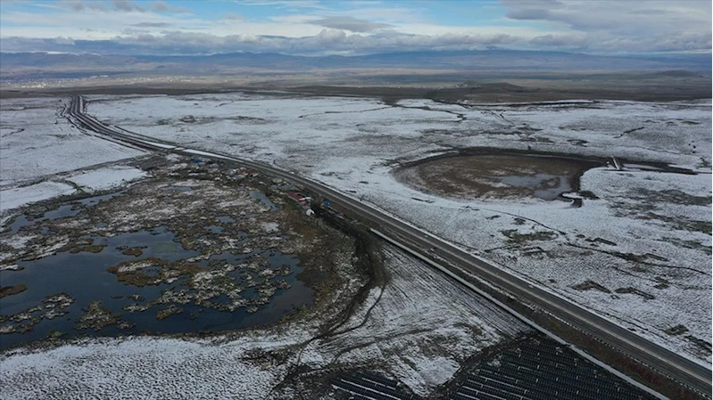 Buzlanmaların oluştuğu ve çevresi karla örtülen göl, drone ile görüntülendi.