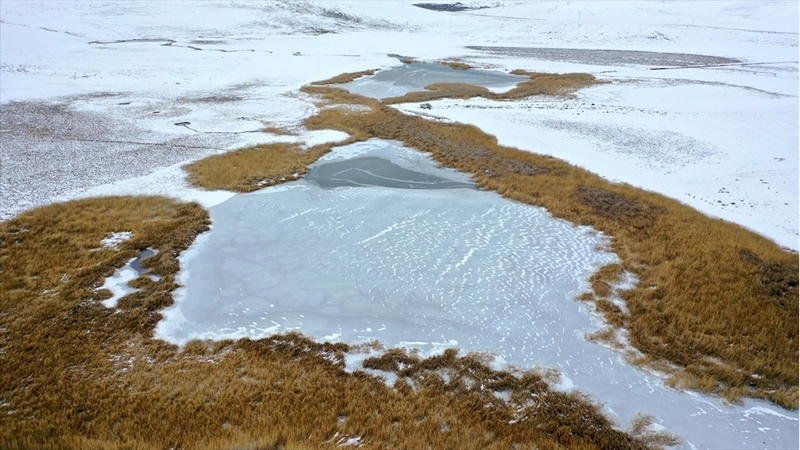 Kars'taki tescilli Lavaş Gölü'nün yüzeyi dondu