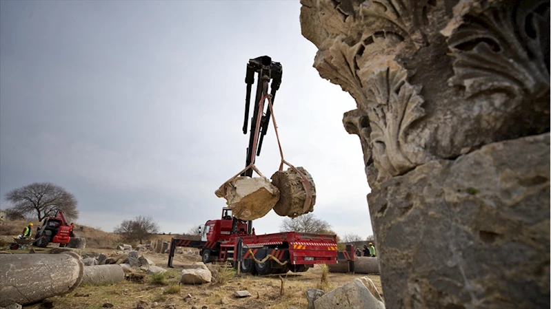 Antik kentte bulunan ve Kahramanmaraş merkezli 6 Şubat 2023'teki depremlerde yıkılan sütunlar, uygun şekilde restore edildikten sonra eski görünümüne kavuşturuluyor.