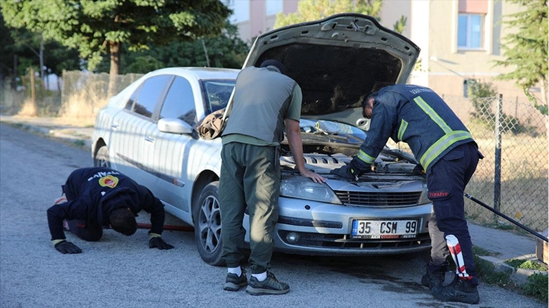 Köpeklerden kaçan su samuru otomobilin kaputuna sığındı