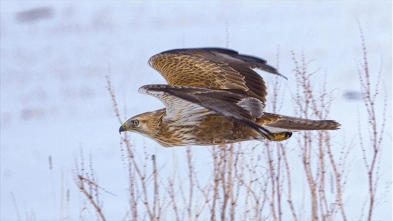 Yılan, kertenkele, kör fare hatta tavşan gibi türleri de avlayarak hayatını idame ettirmeye çalışan kızıl şahinler, karla kaplı arazide avlanırken görüntülendi.
