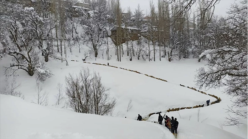 Küçükbaş hayvan sürüsünün kar örtüsü arasındaki yolculuğu görüntülendi