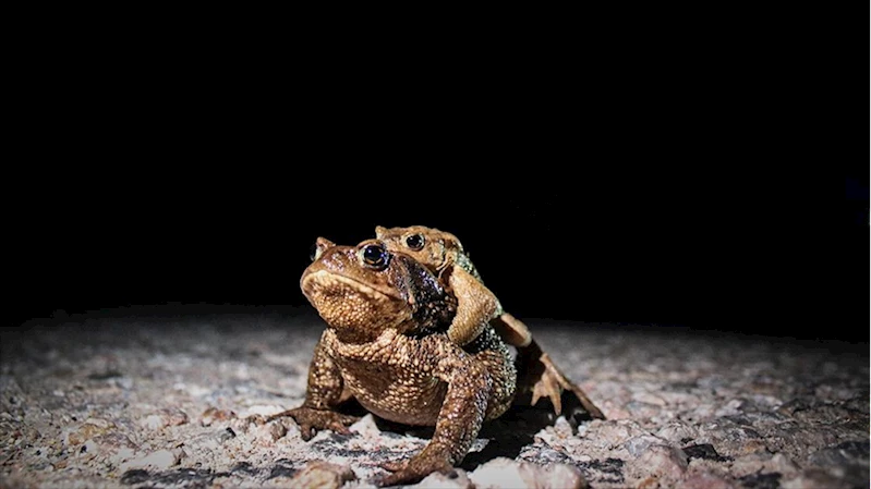Yolun karşısına geçmeye çalışan yüzlerce kurbağa ilginç görüntüler oluşturuyor. Bazıları birbirlerinin sırtında yolun karşısına geçmeye çalışırken, bazıları da geceleri fark edilmedikleri için araçların altında ezilerek ölüyor.