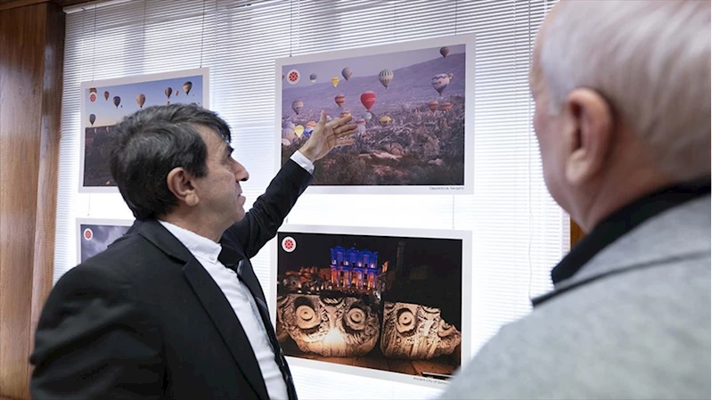Ege sahilleri, antik kentler, tarihi yapılar ve manzaraların yer aldığı 40 kareden oluşan sergiyi gezen Ertaş, fotoğraflarla ilgili bilgi aldı.