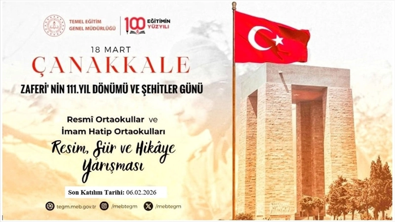 ANKARA (AA) - Ortaokul öğrencilerine yönelik resim, şiir ve hikaye yarışması, 18 Mart Çanakkale Zaferi ve Şehitleri Anma Günü dolayısıyla şehitleri anmak, Türk milletinin kahramanlık destanını gelecek nesillere aktarmak ve öğrencilerin tarih bilincini güçlendirmek amacıyla yapılacak.