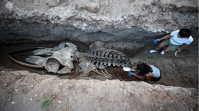 İki gün içinde iskeletin tamamı topraktan çıkarılacakProjeyi yürüten MEÜ Su Ürünleri Fakültesi İşleme Teknolojisi Ana Bilim Dalı Öğretim Üyesi Prof. Dr. Ayas da kazı çalışmalarında 4. günü geride bıraktıklarını kaydederek, "Şu an kafa, boyun omurları ve göğüs bölgesinin tamamını toprak altından çıkarttık. Bel ve kuyruk omurları kısmı kaldı. İki gün içerisinde de tüm iskeleti müzemizin bahçesinde çıkartmayı planlıyoruz." bilgisini verdi.