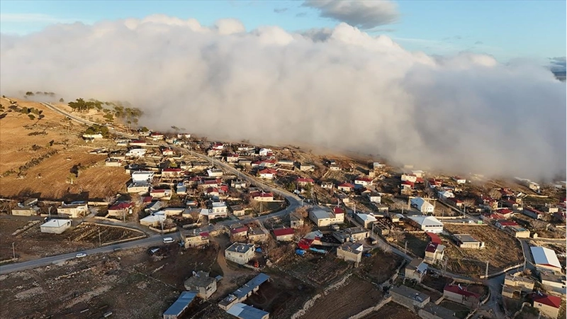Görüntülerde evler, yollar, cami ve mahalle meydanının sis bulutuyla bütünleşen manzarası yer aldı.