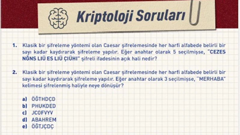 ANKARA (AA) - İnternet sitesinde, klasik bir şifreleme yöntemi olan "Caesar" ve "Route" sistemleriyle hazırlanmış 5 soru yer alıyor.