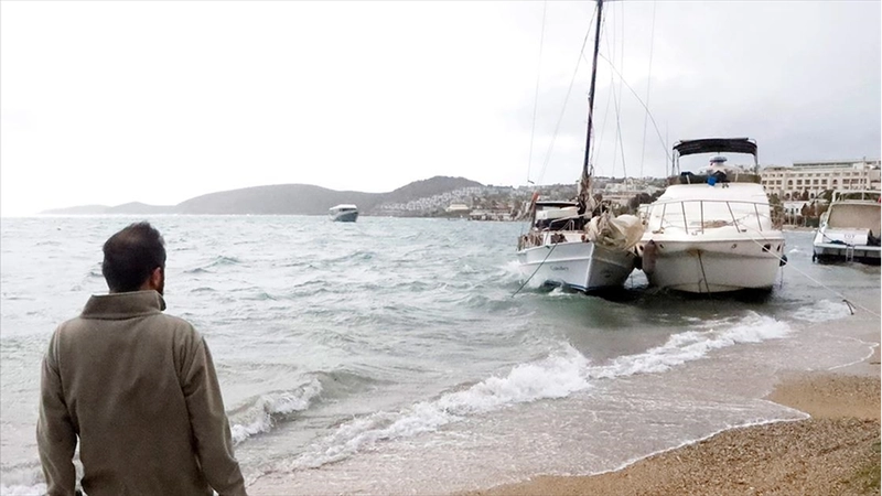 Gümbet sahilinde ikisi yelkenli, ikisi de motoryat olmak üzere 8 tekne bağlı bulundukları yerden ayrılarak kıyıya sürüklendi.
