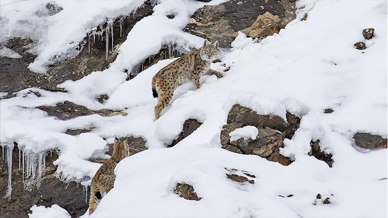 Bölgede nesli tehlike altındaki anne vaşak ile iki yavrusu da milli parkın karla kaplı dağlarında yiyecek ararken AA muhabiri tarafından görüntülendi.